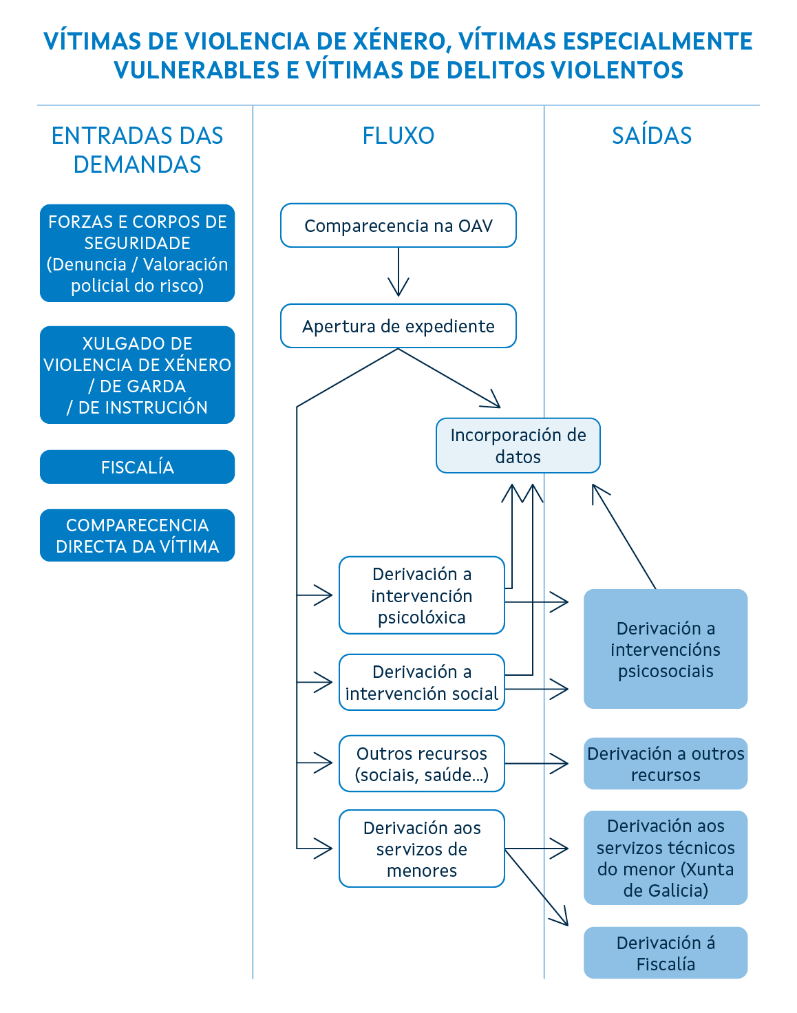 - Facilitar orientación ás vítimas de delitos en relación cos servizos sociais e recursos públicos dispoñibles para a súa atención.